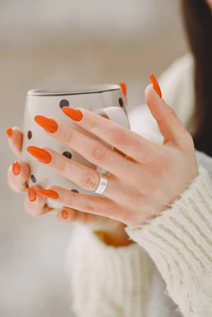 Seasonal designs, particularly fall nails, use warm colours such as orange, brown, gold and burgundy, and are sometimes accented with leaf or pumpkin art. They’re cosy, fashionable, and ideal for fall parties.