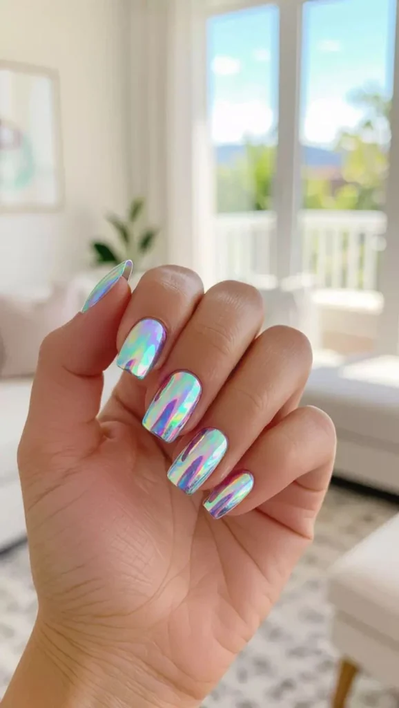 Holographic nails shift colours in response to light, producing a rainbow-like, prismatic look. They’re fun, stylish, and eye-catching—a must-have for anyone who appreciates modern beauty.